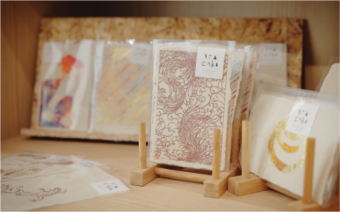![]()  The glass screen in front of the entrance using “koyori washi” (Japanese paper) is also a masterpiece created by the artisans of the Ikazaki company. Gilding Washi postcards are also available at the shop!