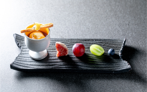 A dining experience that can only be enjoyed at Dogo Miyu. It is the marriage of food, space and hospitality of the staff. Higuchi says, “We use fresh local ingredients such as Ehime sea bream from the Seto Inland Sea, Iyo beef and vegetables from the prefecture.” The luxurious, creative cuisine served in beautiful dishes in a modern, Japanese-style space with a stone garden and two types of iron objects will enrich your trip to the “modern hot spring cure”.