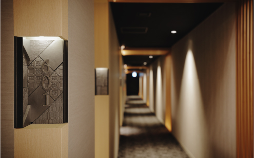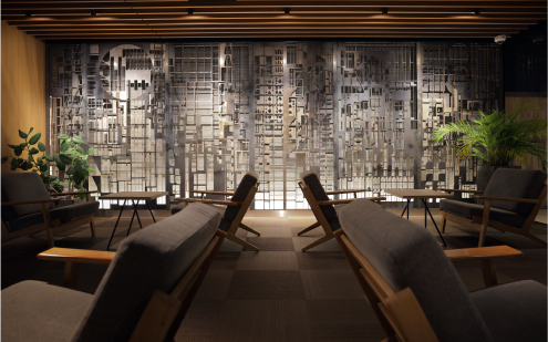 ![]()  Adorning the walls of the Sky Lounge is “Matrix I” by Takuro Nishinaga, an iron artist from Ehime Prefecture. The three-dimensional object, with its multiple layers of geometric holes, was created by randomly using discarded steel plates. The free atmosphere of the artist’s intentions being unleashed and created resonates comfortably to the five senses after a hot bath!