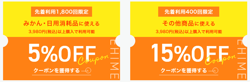 - みかん・日用消耗品に使える:3,980円以上 5%OFF お1人様10回(1注文あたり3回) 先着1,800回