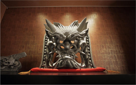 3階のロビーに上がると、1.5メートル四方の巨大な置物「笑う鬼瓦」に目が釘付けに。実はこれ、今治市菊間町で約750年の伝統を持つ菊間瓦の技術が生んだ愛媛のすごモノ。“厄を払い福を呼ぶ“と言われるユニークな縁起物は、宿泊客のインスタスポットになっているそう。